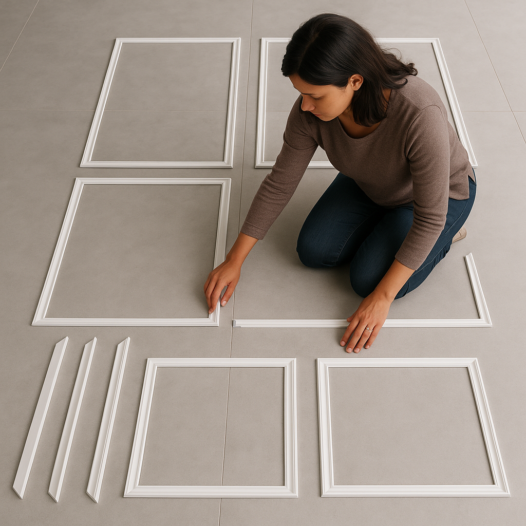 Unbox all pieces and lay them out on the floor according to your design template (rectangles, squares, chair rails, etc.).