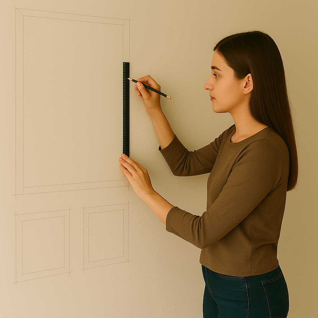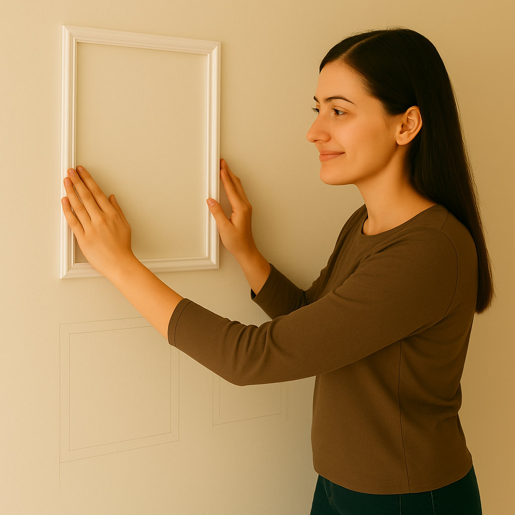 Remove the adhesive backing and carefully attach the pre-assembled frames (or individual pieces) to the marked positions on the wall.